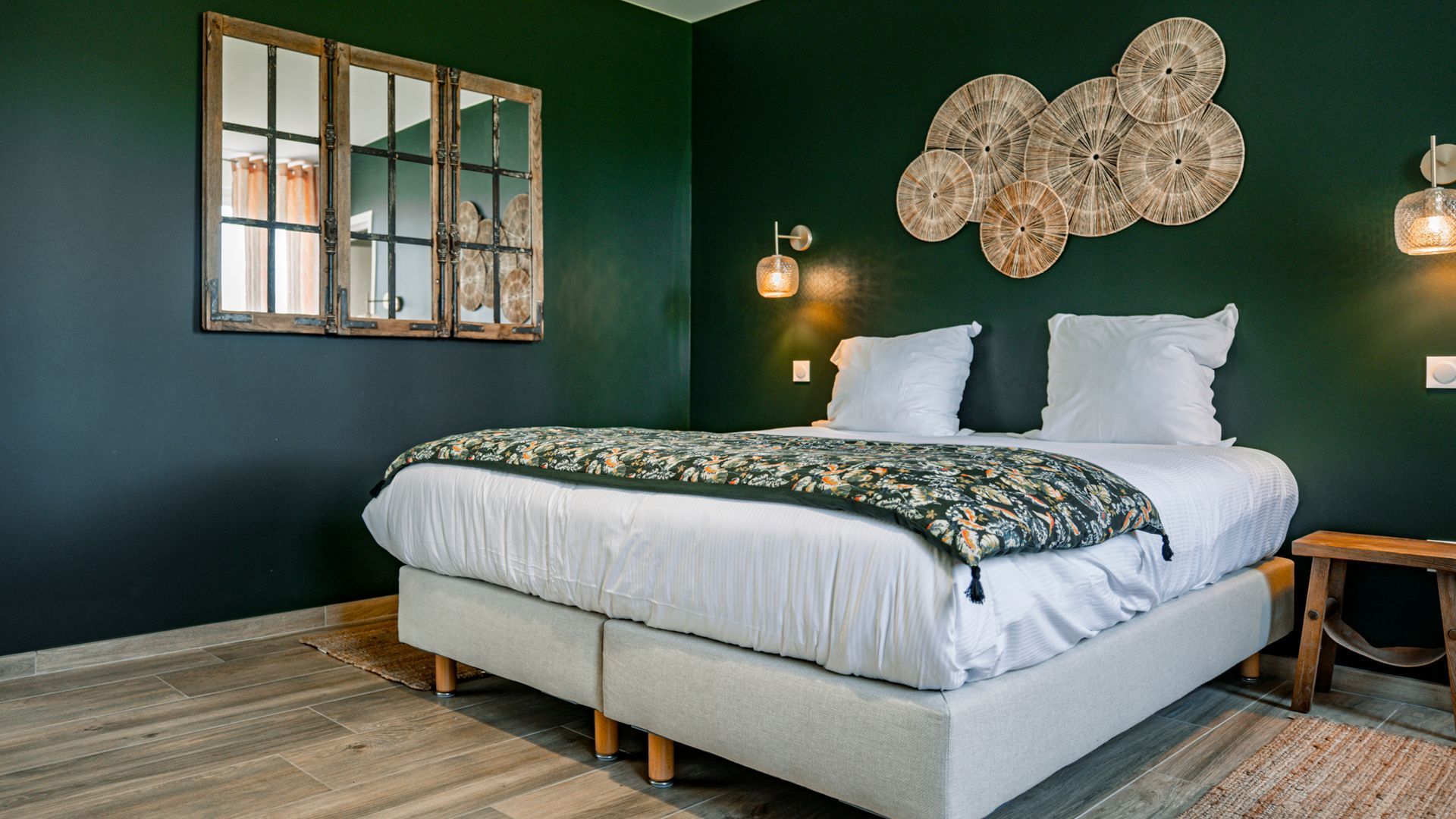 Nichée au cœur du Domaine, L'Écrin de Mousse est une invitation à la quiétude et à l'évasion. Sa palette de verts profonds, entre forêt et amande, évoque la fraîcheur d'un sous-bois tapissé de mousse, où la nature déploie toute sa douceur.