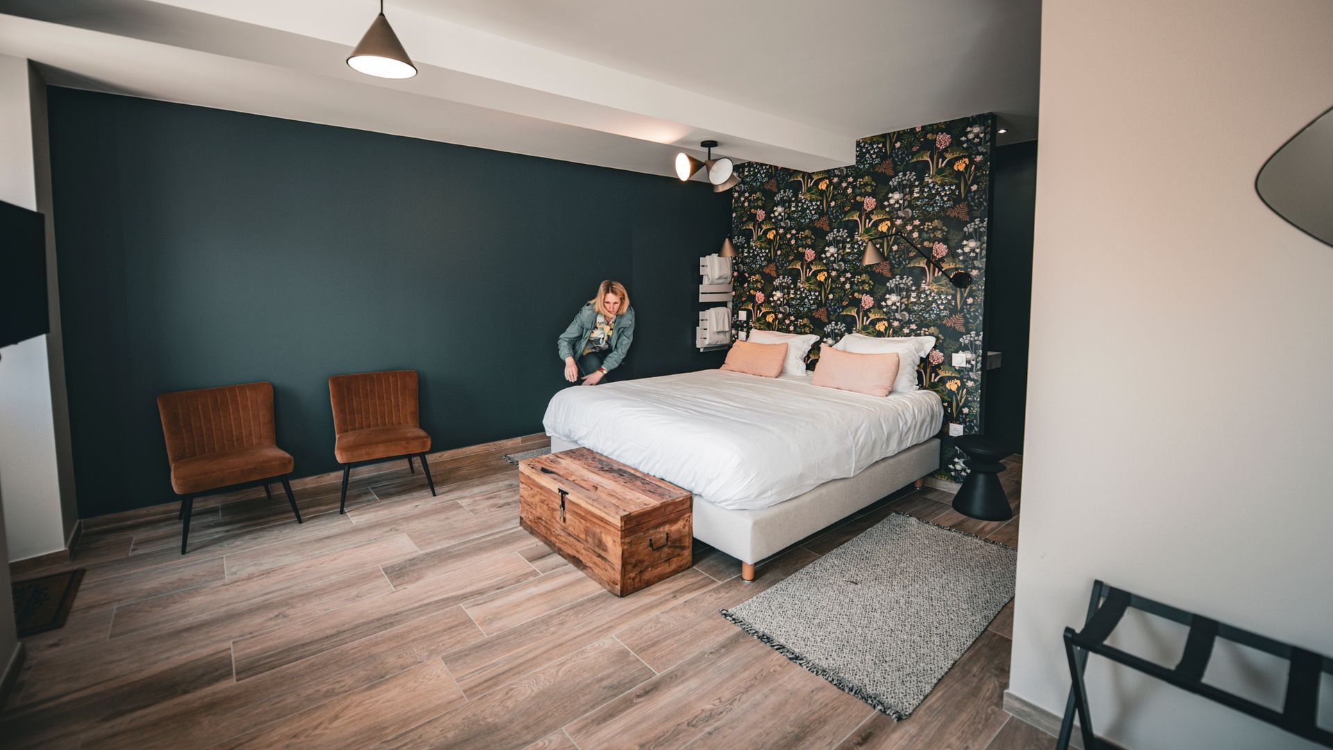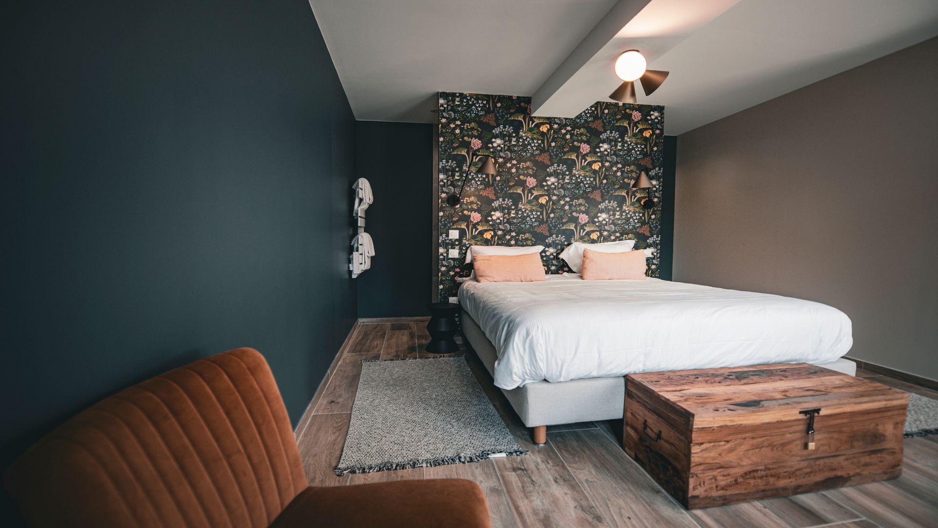 Plongez au cœur d'une atmosphère envoûtante avec Les Murmures de la Forêt , une chambre où la nature s'invite jusque dans les moindres détails. Son bleu profond évoque la quiétude des sous-bois à la tombée du jour, tandis que le jaune ocre rappelle la lumière dorée filtrante à travers le feuillage.