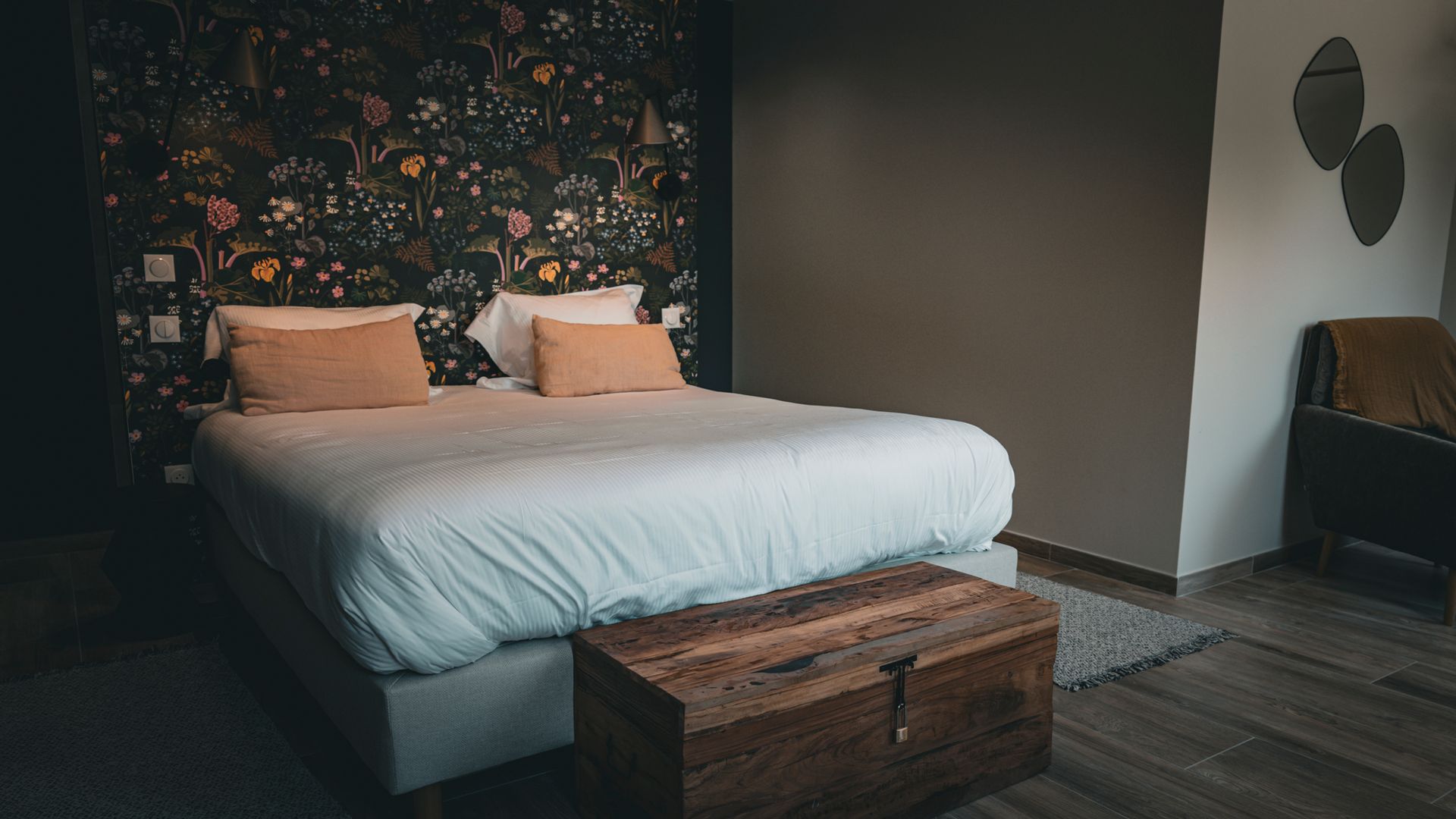 Les murs se parent d'un somptueux papier peint fleuri, véritable tableau vivant où fougères et ramures semblent chuchoter les secrets de la forêt.